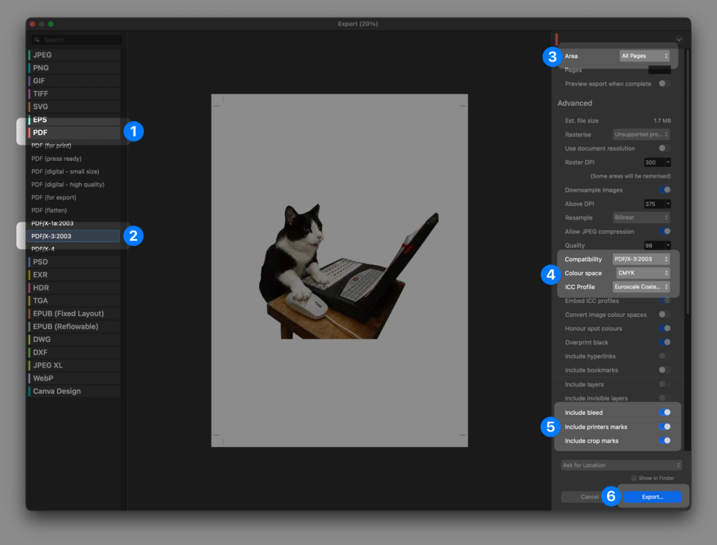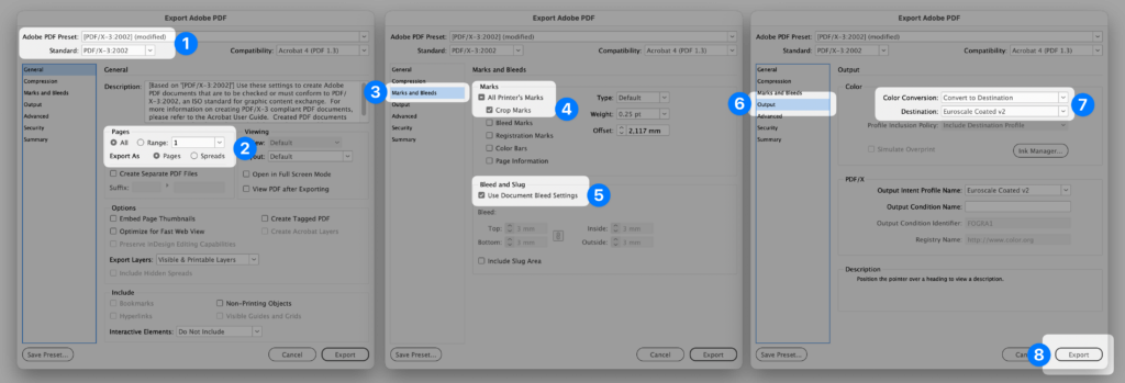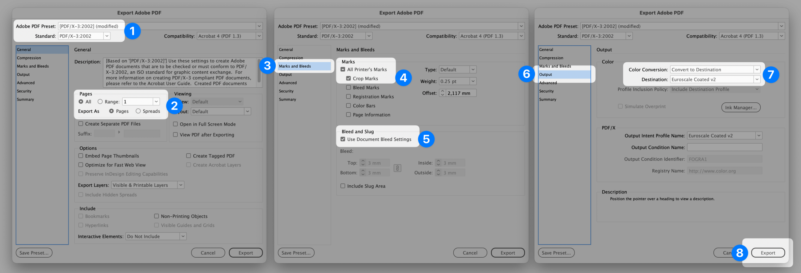 Und schließlich beim Schreiben der PDF: Datei → Exportieren → Format: PDF → Marken und Anschnitt → Anschnittseinstellungen des Dokuments verwenden (oder alternativ: Anschnitt: 3 mm). Die Seiten als Einzelseiten speichern (nicht als Druckbogen). Bitte auch nur Schnittmarken generieren, keine anderen. Wir akzeptieren nur PDF/X-3-Dokumente.
