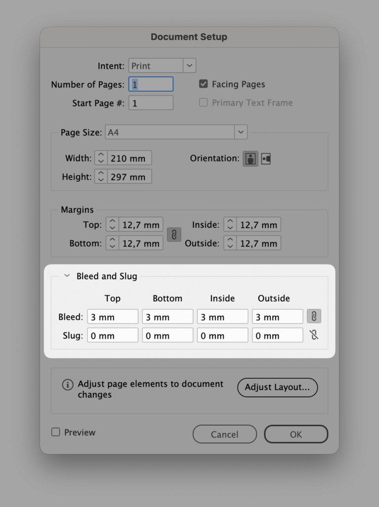 In InDesign kann das Nettoformat eingeben werden (also bei DIN A4 210 × 297 mm). Es muss jedoch der Beschnitt an drei Positionen im Dokument definiert und angewendet werden: Datei → Dokument einrichten → Mehr Optionen → Anschnitt → 3 mm).