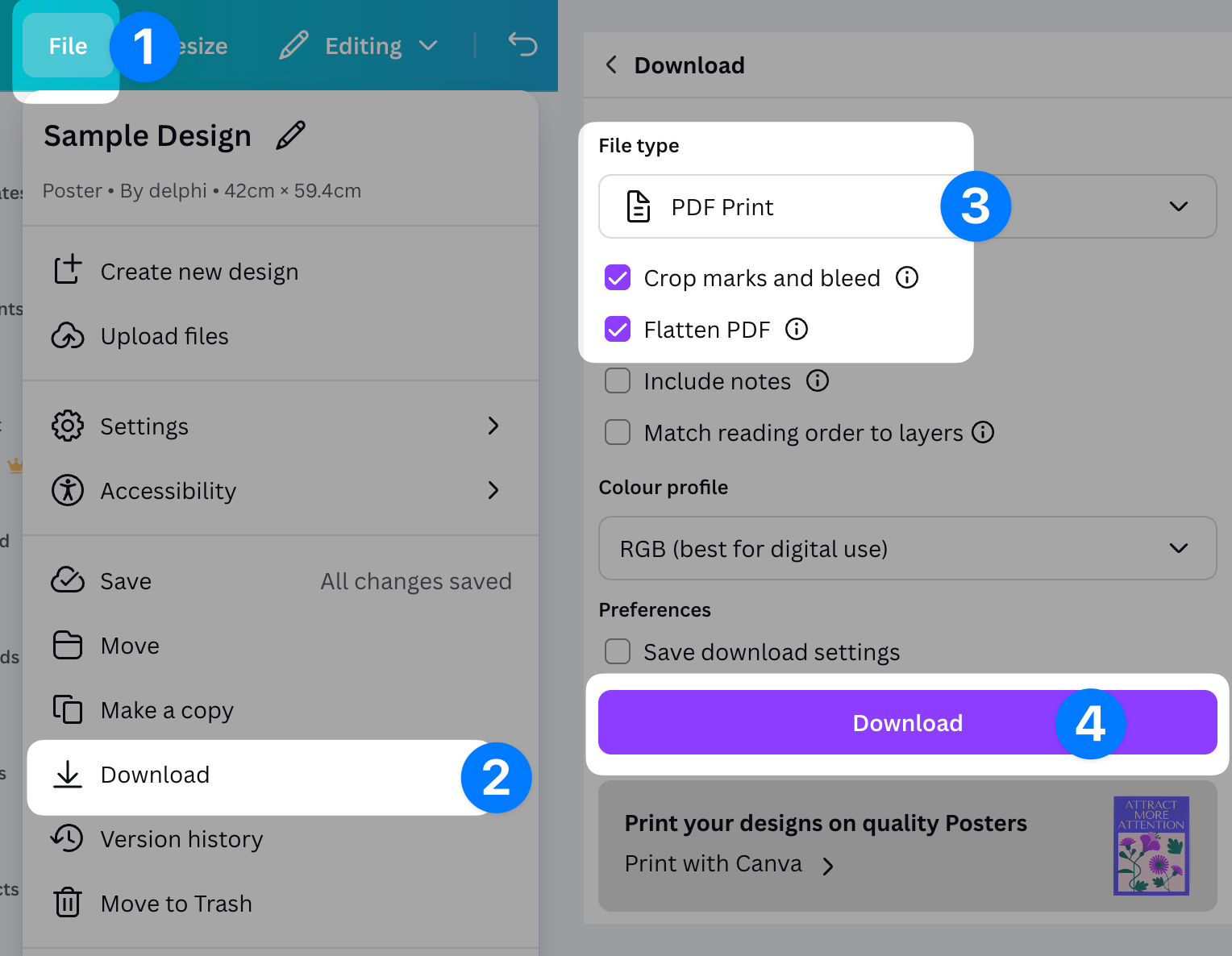 In Canva gilt es, die fertigen Druckdateien als Druck-PDF zu exportieren. Hier ist es besonders wichtig, Schnittmarken und Beschnitt zu aktivieren. Unbedingt muss das PDF auch geglättet sein, also „PDF glätten“ auch auswählen.